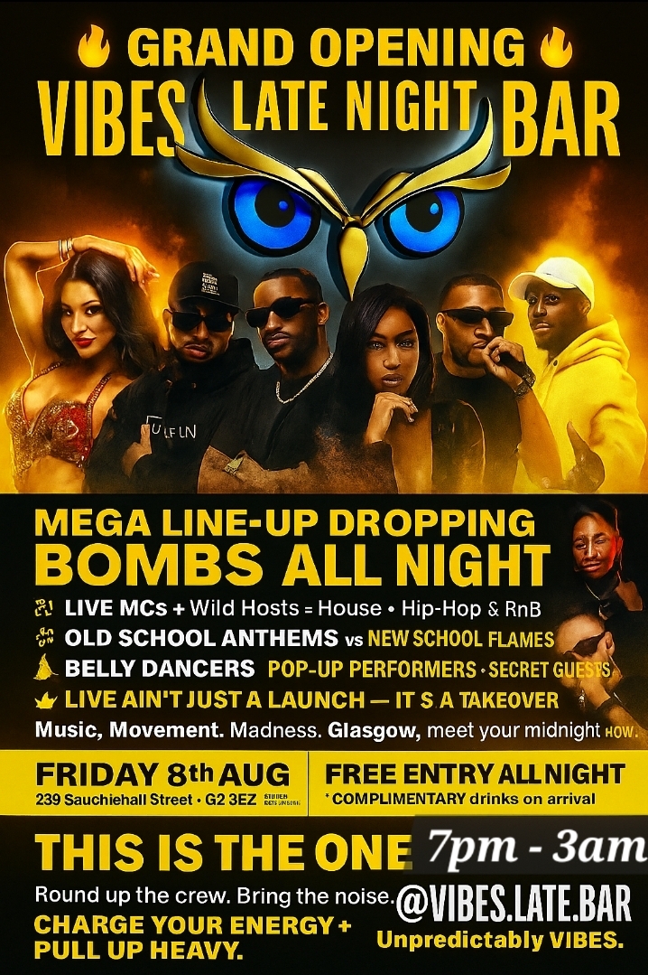 Grand opening of Vibes Late Night Bar Fri 8th Aug. 239 Sauchiehall Street G2 3EZ. Glasgow City shutdown 100% free entry for your best oldschool classics from 70s - 90s, Afrobeat, Samba Dancers, Hip-hop, Live singers, Country line dance MCS, DJs +more