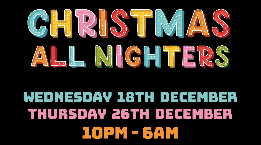 Join us on Weds 18th + 26th Dec for two HUGE Christmas parties, with a 6am finish.