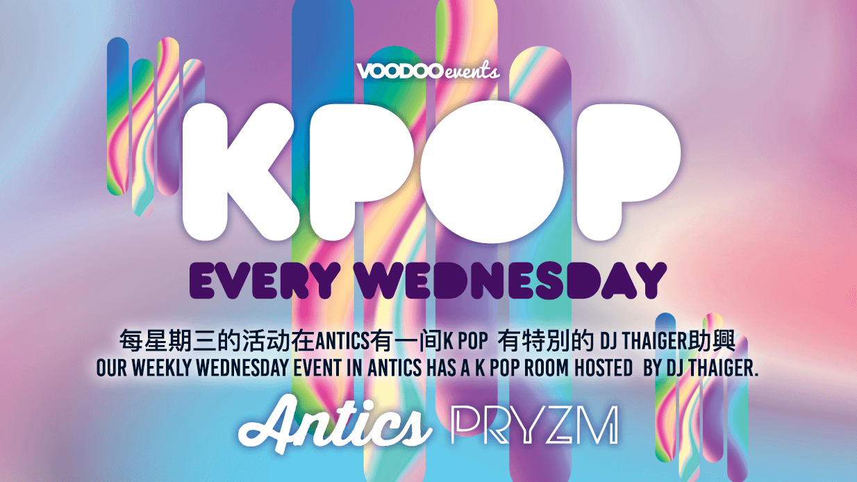 每星期三的活动在Antics有一间K Pop 有特別的 DJ Thaiger助興.