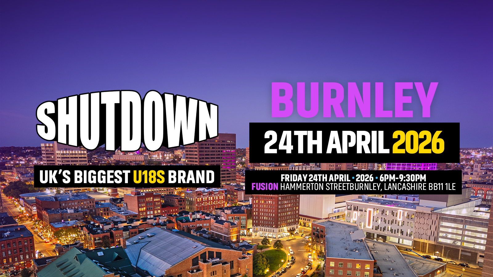 SHUTDOWN — the UK’s biggest under-18s event brand by far! — first started right here in Burnley. What began as a local movement has grown into a nationwide force, setting the standard for U18s events across the country. Now, it returns home — bigger, louder, and more powerful than ever.