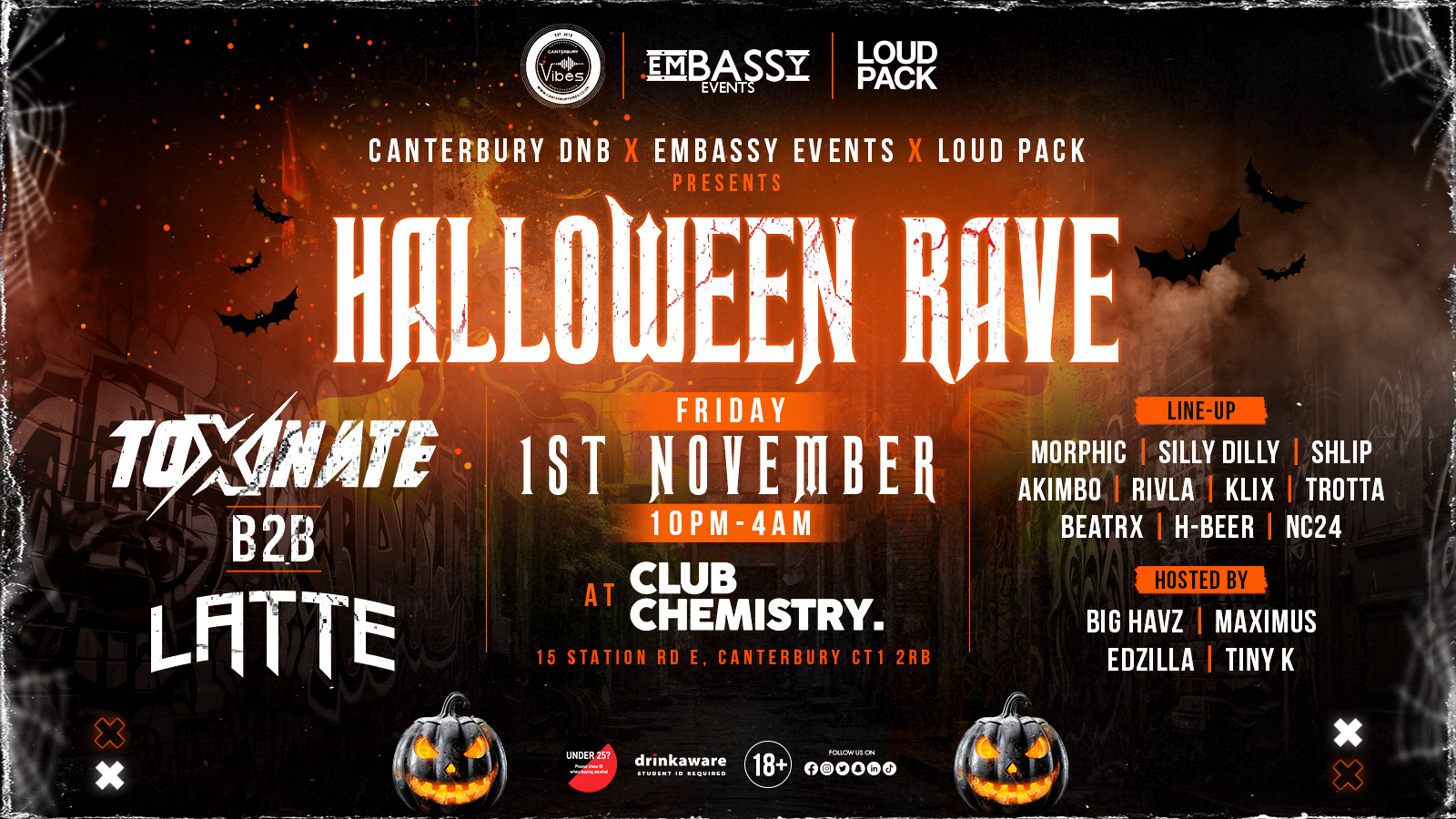 HALLOWEEN IS HERE!! We are bringing the most requested artists to Canterbury this Halloween for a massive spooky night at Club Chem. Friday 1st November we are bringing TOXINATE B2B LATTE for all the drum and bass heads who have been asking for them to come down!
