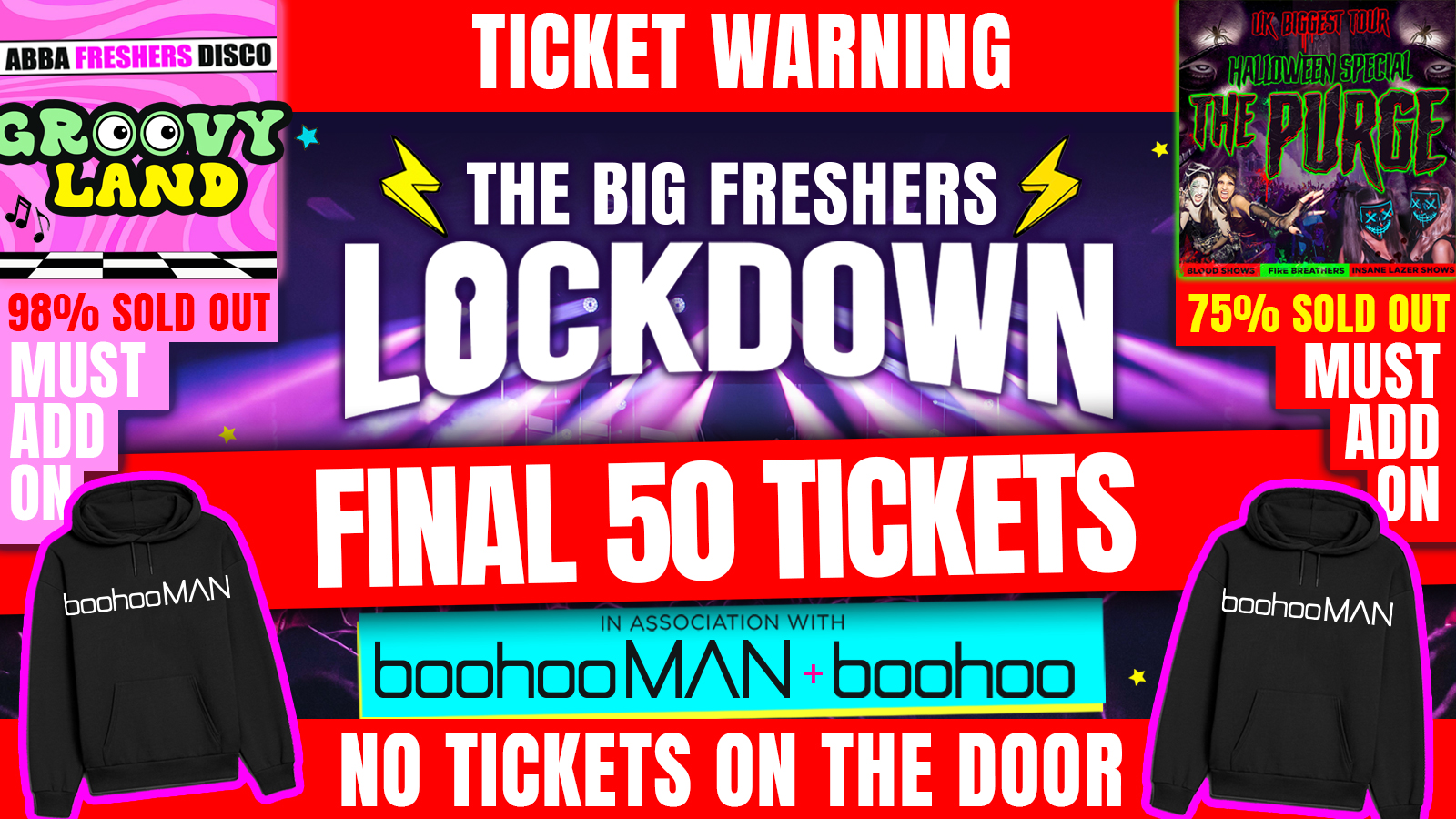 TO GUARANTEE ENTRY, YOU MUST BUY A TICKET ASAP! DO NOT BE THAT FRESHERS THAT DIDN’T GET A TICKET FOR ‘THE BIG FRESHERS LOCKDOWN’