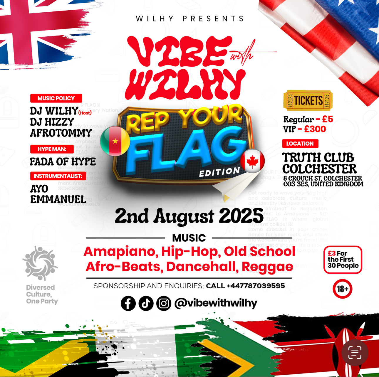 Join us for an electrifying night at "Vibe with Wilhy - Rep Your Flag Edition"! This event promises to bring together the best in entertainment, featuring top-notch DJs, hypemen, and talented instrumentalists. Celebrate the diversity of cultures as we encourage everyone to rep their flag, showcasing vibrant colors and spirited pride.