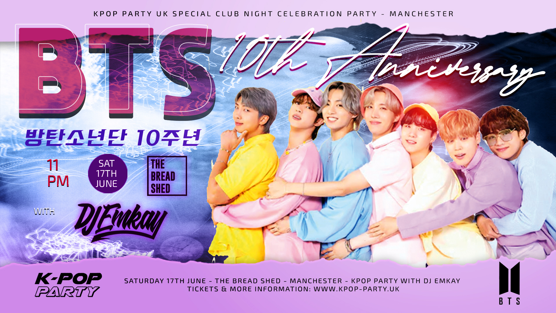 서울에서 온 DJ Emkay 와 함께 하는 방탄소년단 데뷔 10주년!! 불타는 토요일을 만들 수 있도록 핫하고 다양한 컨텐츠를 맨체스터 최고급 클럽에서 준비했습니다. 🔥 🔥