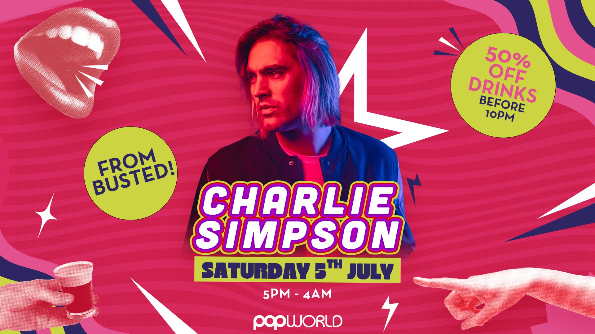 British pop-rock legend Charlie Simpson is coming to Popworld Chelmsford for one epic night! Best known as a member of Busted, Charlie is hitting the decks for a high-energy DJ set, packed with Popworld classics and feel-good anthems.