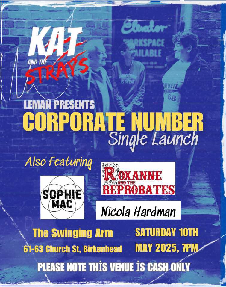 Downstairs at The Swinging Arm, Birkenhead: Kat and The Strays are releasing their first single “Corporate Number”. This is their first single launch party!