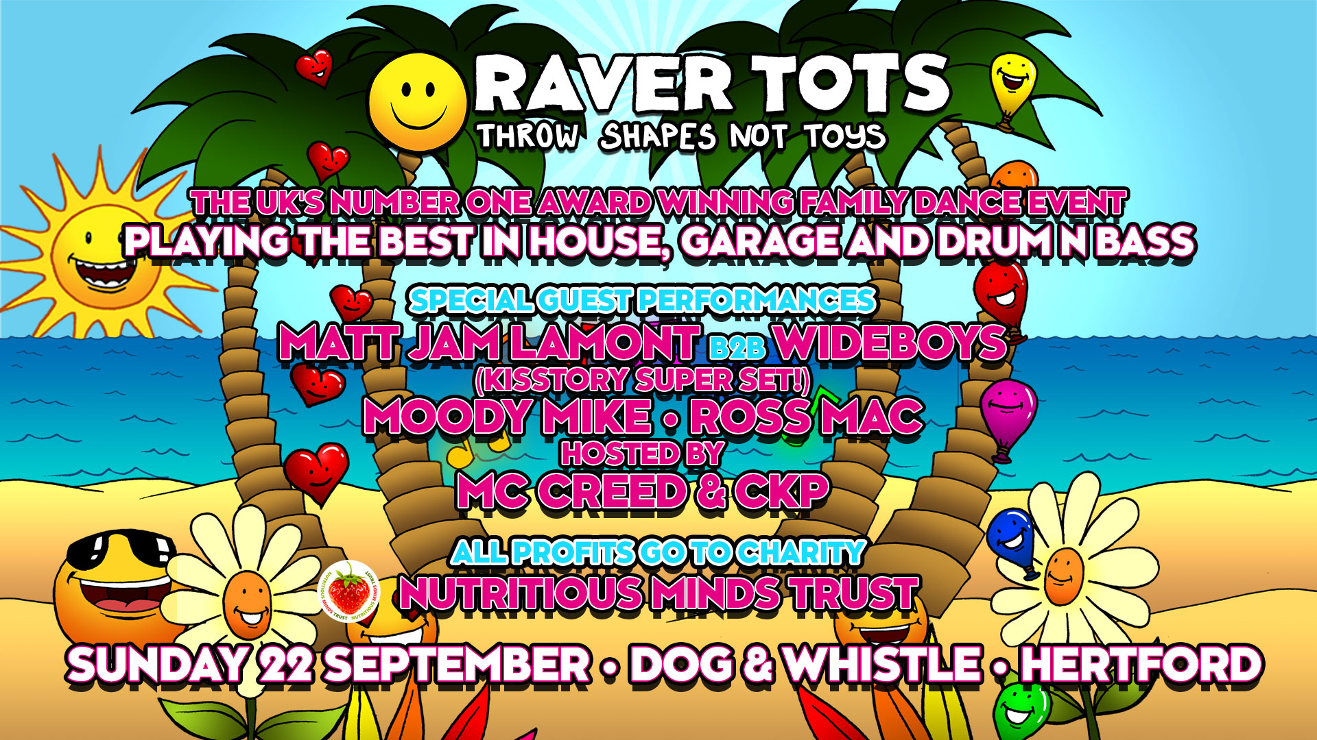 Raver Tots is coming to Hertford for the ultimate family dance party, playing the best in House, Garage, and Drum and Bass with Kisstory legends Matt Jam Lamont and Wideboys + loads more.