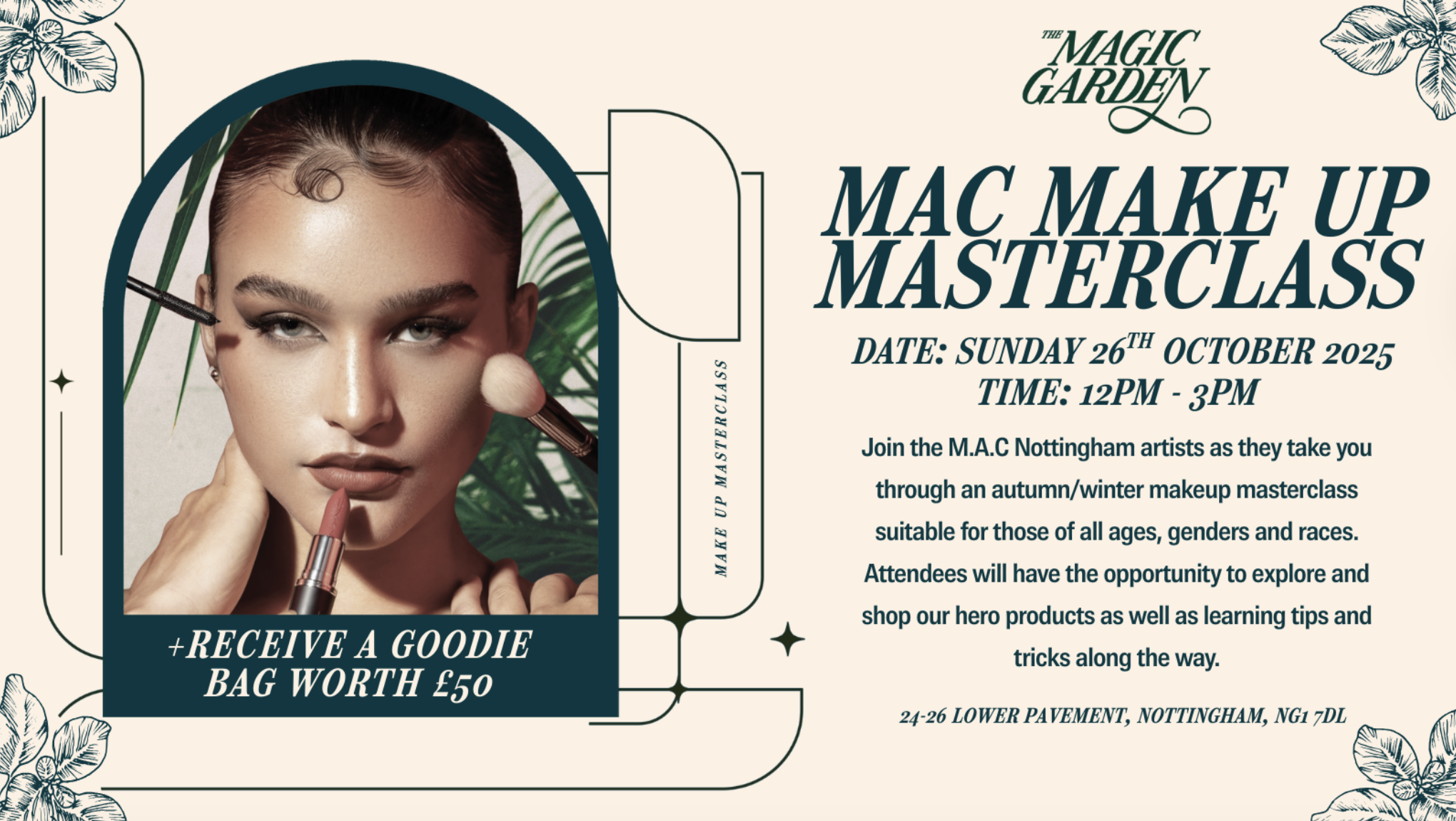 Join the M.A.C Nottingham artists at The Magic Garden as they take you through an autumn/winter makeup masterclass suitable for those of all ages, genders and races. Attendees will have the opportunity to explore and shop our hero products as well as learning tips and tricks along the way.