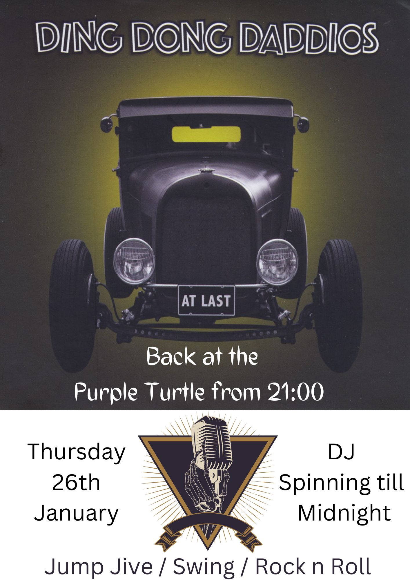 The Ding Dongs Daddios make a return to the Purple Turtle Stage on the last Thursday of the month bringing you a night to remember Jump n Jive, Swing & Rock n Roll. DJ Jim B. Donovan to blend the night into something special and remember, well we hope not had a glass of wine too much HAHA. And be back the next month to remind yourself how good last month actually was.