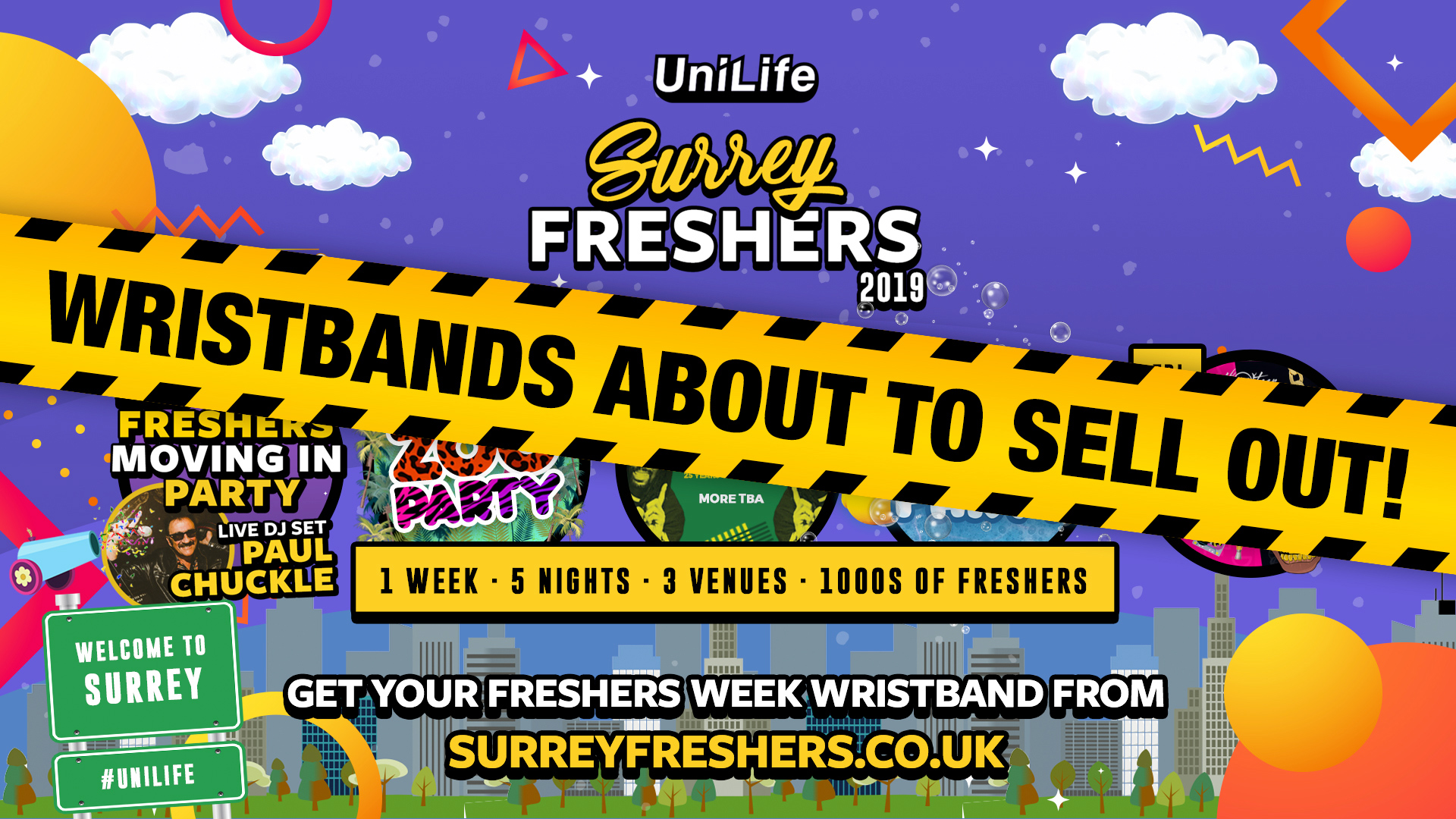 You'll be able to collect your fabric wristband (festive style!) from 10PM at our HUGE Moving in Party along with 1500 other Freshers! We recommend securing your wristband ASAP there are waaaaay more Freshers than any venue in Surrey can hold - The wristbands are very much LIMITED! The earlier you purchase, the cheaper the price tier.
