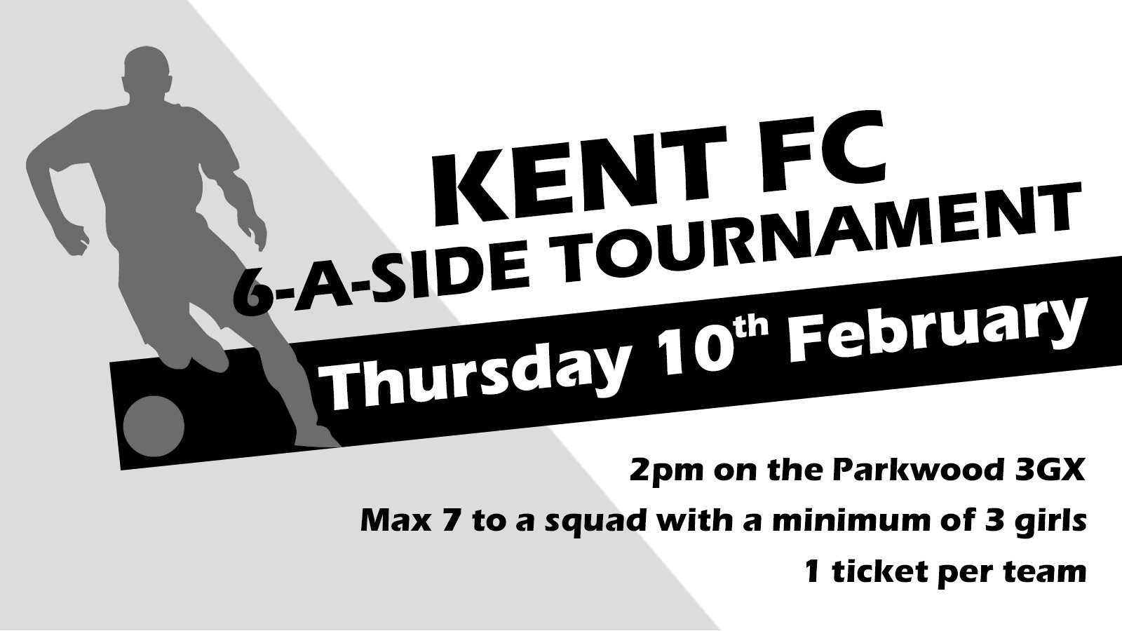 Kent FC presents there 6-a-side fundraiser. You dont want to miss out on this! Prizes for the top 3 teams. Starts 2:00pm, be there 1:30pm to be ready