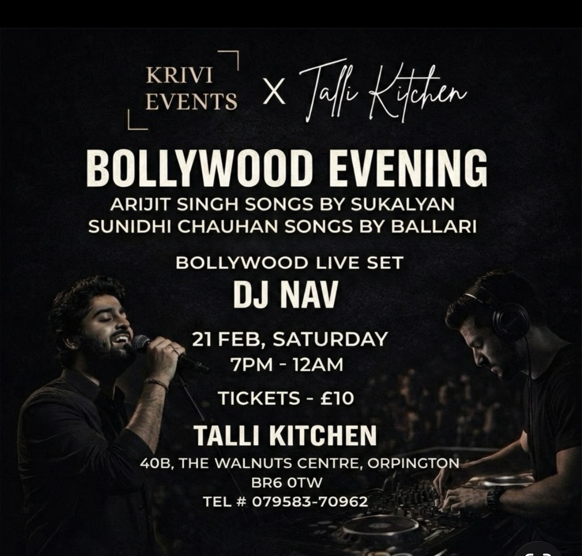 Krivi Events in collaboration with Talli Kitchen presents a Bollywood Evening on 21 Feb 2026 (7 pm onwards till 12 am). The evening will host Sukalyan Das (a well known artist in London) known for his covers of Arijit Singh, KK, Sonu Nigam, Palash Sen, Mohit Chauhan and many more. Sukalyan is a one man band where he recreates the background music himself, plays an electric guitar and has an impeccable voice. Follow him on YouTube @musicbydas. We have Ballari singing covers of Sunidhi Chauhan Ballari has a mesmerising voice and it just sets the right tone for a special evening.
