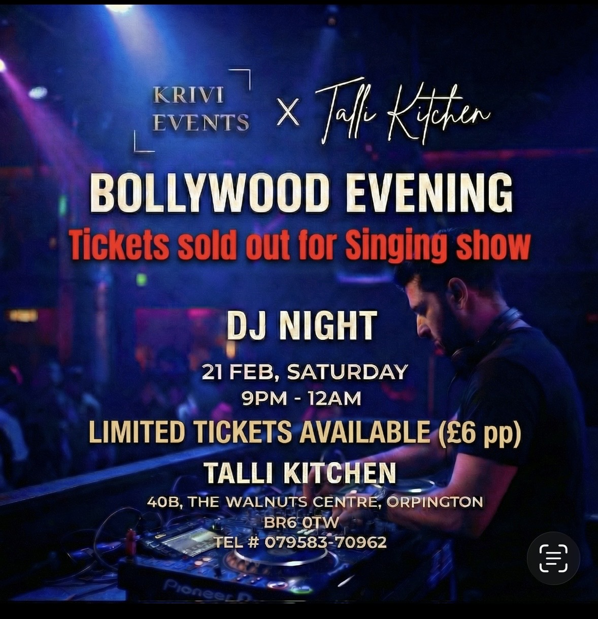 We have sold out tickets for the Singing event . There are a few limited tickets available only for the DJ Night starting from 9 pm onwards.. DJ Nav will be playing a Live Bollywood electrifying set to get everyone grooving on the France floor. Follow DJ Nav on Instagram and YouTube @djnav10. Looking forward to having you join us for this Bollywood evening at Talli Kitchen, Orpington