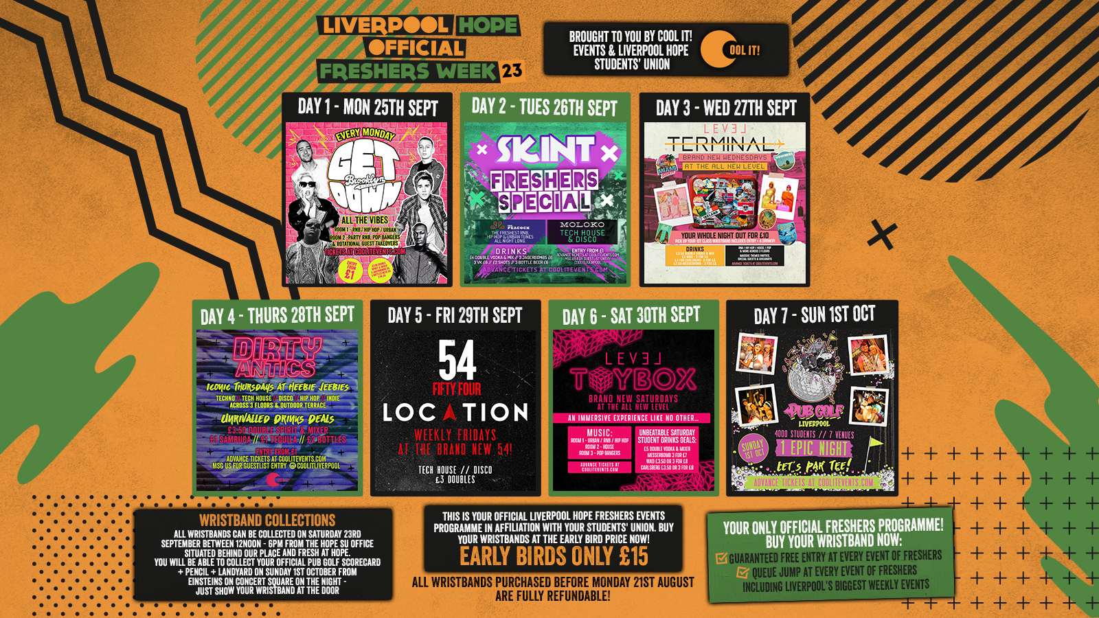This is YOUR OFFICIAL Liverpool Hope Freshers Events Programme in affiliation with your Students Union. BUY YOUR WRISTBANDS AT THE EARLY BIRD PRICE NOW! EARLY BIRDS ONLY £15.