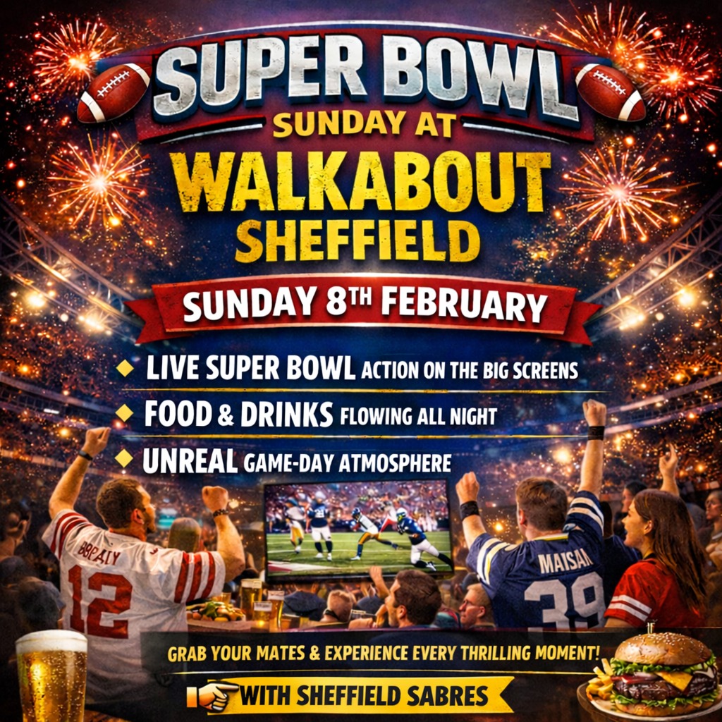 Experience the biggest night in American Football live at Walkabout Sheffield on 8th February, in proud partnership with Sheffield Sabres. Catch every moment of Super Bowl LX across 21 HD TVs, delivering wall-to-wall coverage and non-stop action from kickoff to the final whistle.