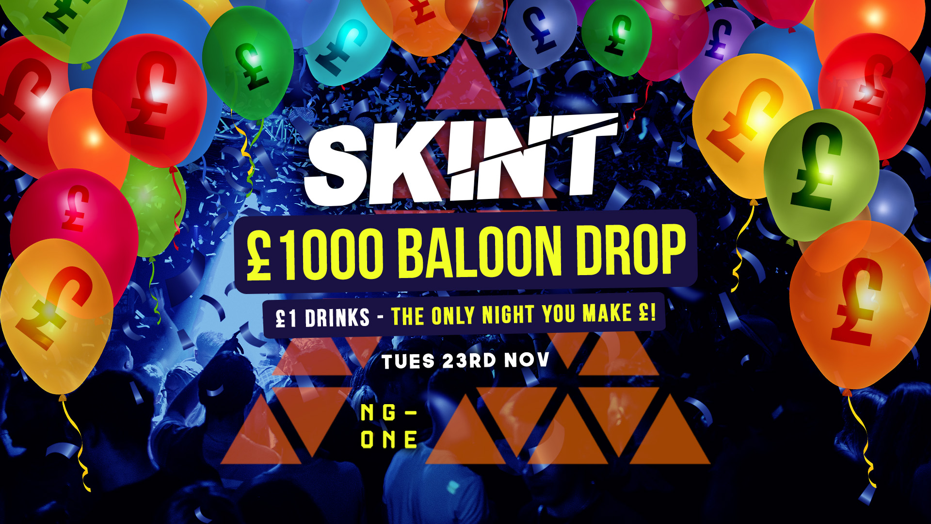 Yes, you're reading that right... £1k worth of goodies including cash, drinks vouchers, and tickets will fall from the ceiling this Tuesday at NG-One...