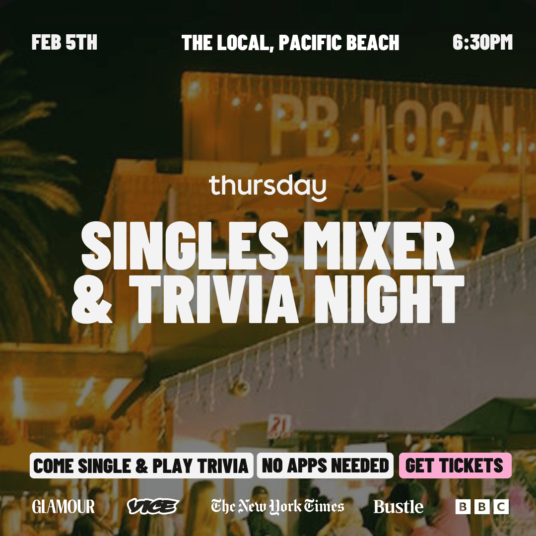 We are stoked to be hosting our first event in February at one of the most popular bars in PB... THE LOCAL! We will be taking over their outdoor beer garden at 6:30pm & filling it with over 100 San Diego Singles. Come hang out, play some trivia and potentially find your date for Valentine's Day! Be sure to get your tickets before they're gone!