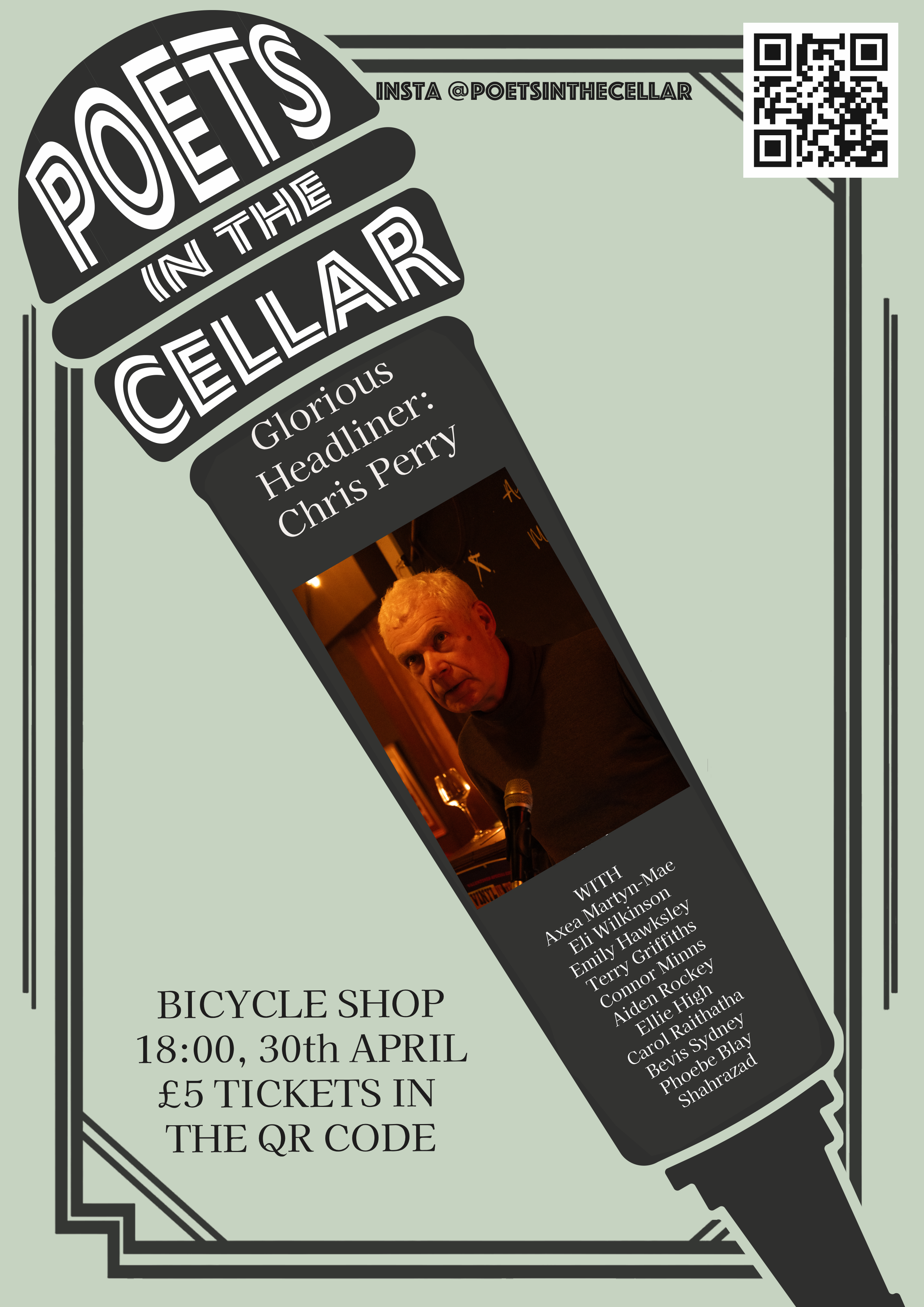 Hey people, welcome back to another Poets in the Cellar. This time we have more poetry and even more cellar. For our April installment, I have the pleasure of introducing our wonderful headliner, Chris Perry. Chris will be joined by a plethora of Norfolk's finest poets, who will provide you with an unforgettable evening of entertainment and inspiration. So grab a ticket, come on down, and hear what the cellar has to offer this month.