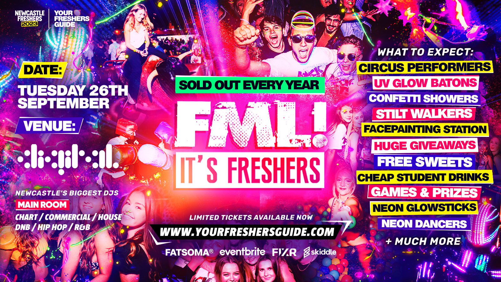We'll be supplying a F**K load of FREE UV Paint, Neon Glowsticks & LED Batons to create a monstrous, immersive nightclub atmosphere like no other! With loads of party games, freebies, performers & entertainment, FML IT'S FRESHERS is truly a ONCE IN A LIFETIME experience!