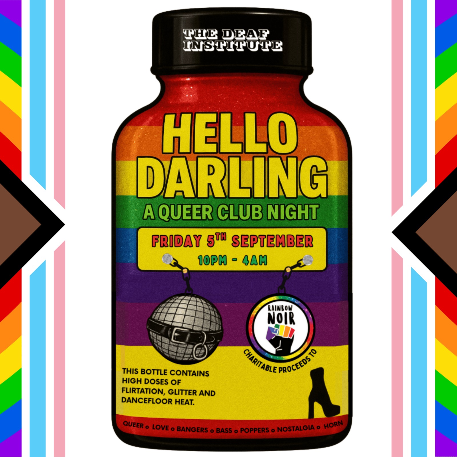 This is our second event following the huge sellout success of the first one in July. We raised over £1000 for Trans Mutual Aid Manchester, and this time we'll be raising money for Rainbow Noir Manchester. This Hello Darling is going to be 3 times bigger - thats right - 3 TIMES BIGGER as we have the entire Deaf Institute venue. The main floor will be your superstar talented DJs spinning the house, nu disco and italo disco that we all love. Smoke machines and laser galores, thumping house music on an incredible sound system where the bass makes your heart skip a beat :) We also have the legendary spinning slags of Manchester who will be doing their thing around the venue, getting the queers up on the stage and just being general slags providing a vibe. The second floor will be up-and-coming talented DJs from Manchester who are breaking into the scene. We are creating a space for new talent to thrive, vibe and get us all moving!