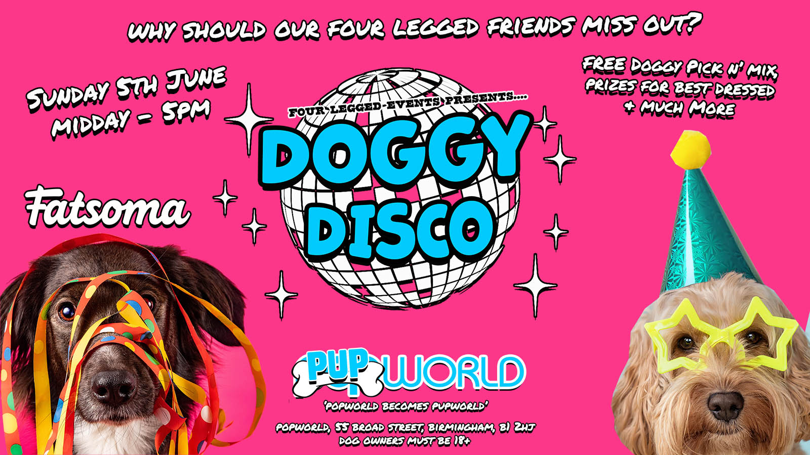 Doggy Disco... that's right you no longer have to leave your dog at home when your want t hit the clubs. Bring your four legged friend along with you to the 'Doggy Disco' as we turn Popworld In PUPWORLD!