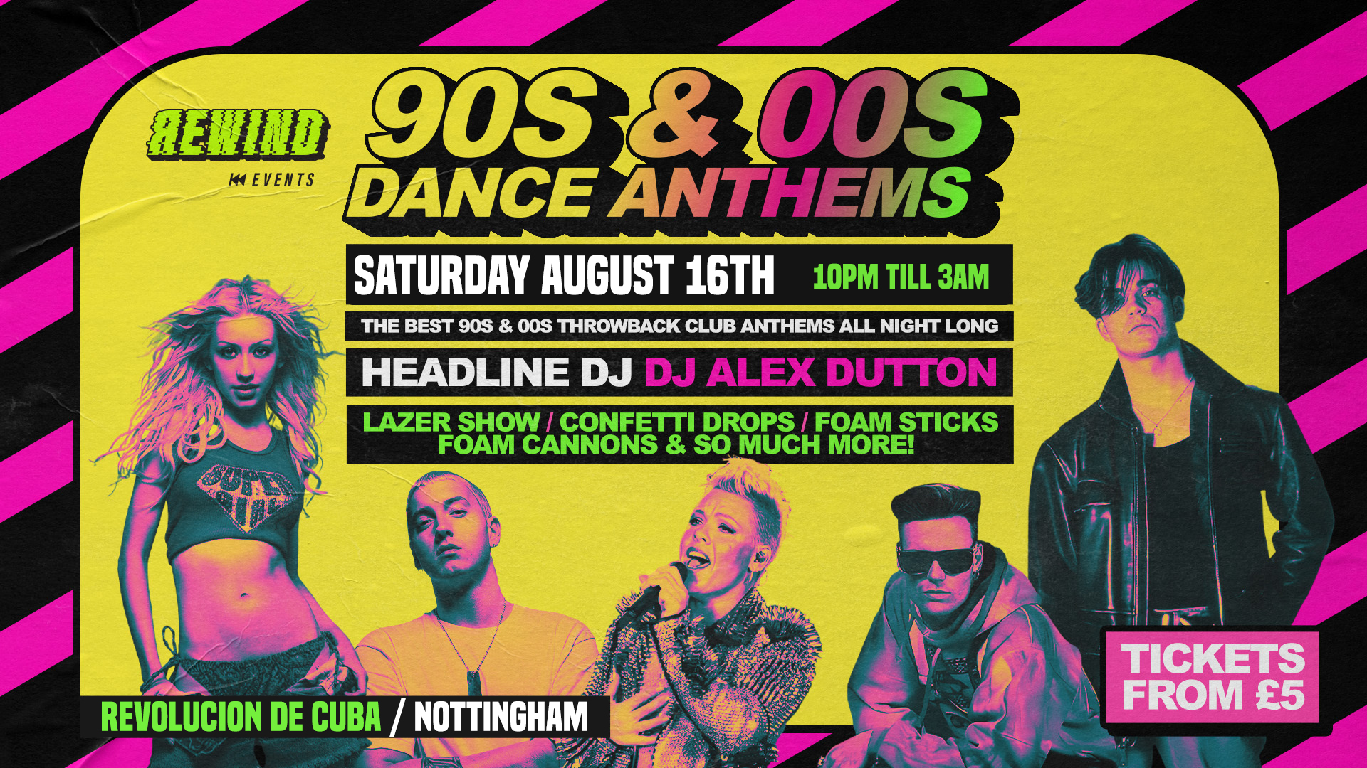 With Stage Dancers to compliment our Rewind resident DJS, We are also Bring the atmosphere with Festival Grade Production, CO2 Uppers, Lasers, 1000s Of Glow Sticks, Foam Machines and much more.