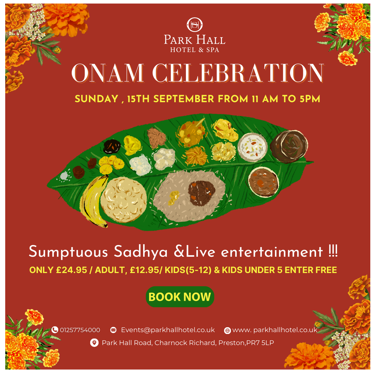 🌟 Celebrate Onam in grand style at Park Hall! 🌺 Dive into the heart of Kerala with an exquisite Sadhya feast that promises to tantalise your taste buds, all while revelling in captivating live entertainment. Make memories like never before with our special offer: just £24.95 for adults and £12.95 for kids! 🥘🎶 Mark your calendars for September 15th, 11 am - 5 pm, and get ready for an unforgettable experience.