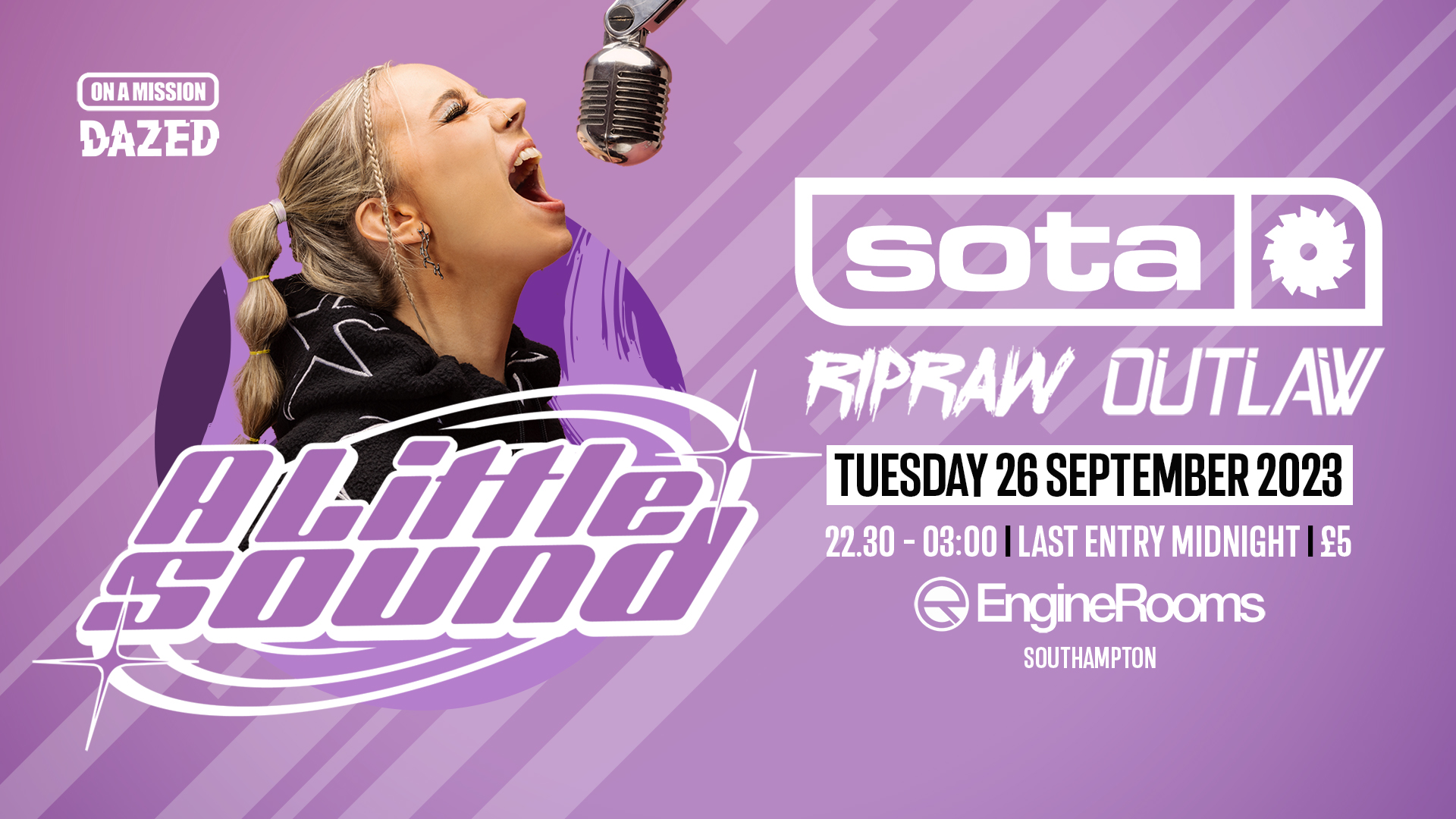The biggest link up in the south west, ON A MISSION x Dazed, returns to Southampton this Freshers with hottest act in the game, A Little Sound! Tuesday 26th September 2023