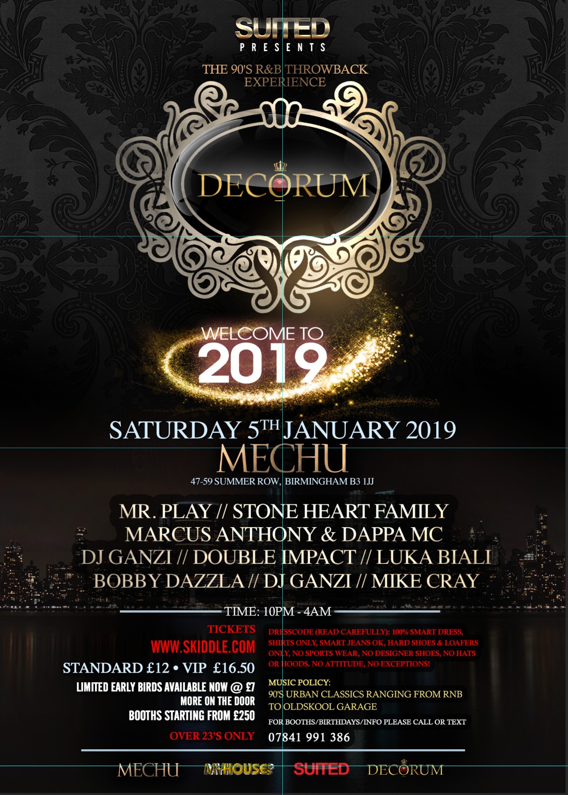 THE DECORUM TEAM WOULD LIKE TO WELCOME THE GROWN & SEXY TO 2019 IN STYLE. COME AND CELEBRATE THE NEW YEAR WITH US AT BIRMINGHAM'S MOST PRESTIGIOUS VENUE :: MECHU:: MUSIC POLICY ON THE NIGHT WILL BE 90'S URBAN CLASSICS RANGING FROM RNB TO OLDSKOOL GARAGE. GET YOUR TICKETS ASAP AS THEY ARE LIMITED AND WILL SELL OUT. SEE YOU THERE #DECORUM