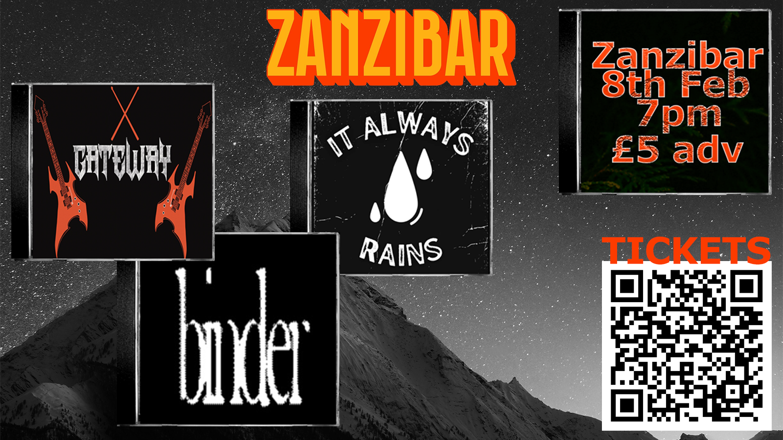 Get ready for a night of electrifying performances by some of the best local bands: Gateway, It Always Rains, and Binder! Join us at Zanzibar in Liverpool for an unforgettable evening of live music that will make you dance, sing, and rock out. From mesmerizing melodies to powerful beats, we've got it all covered.