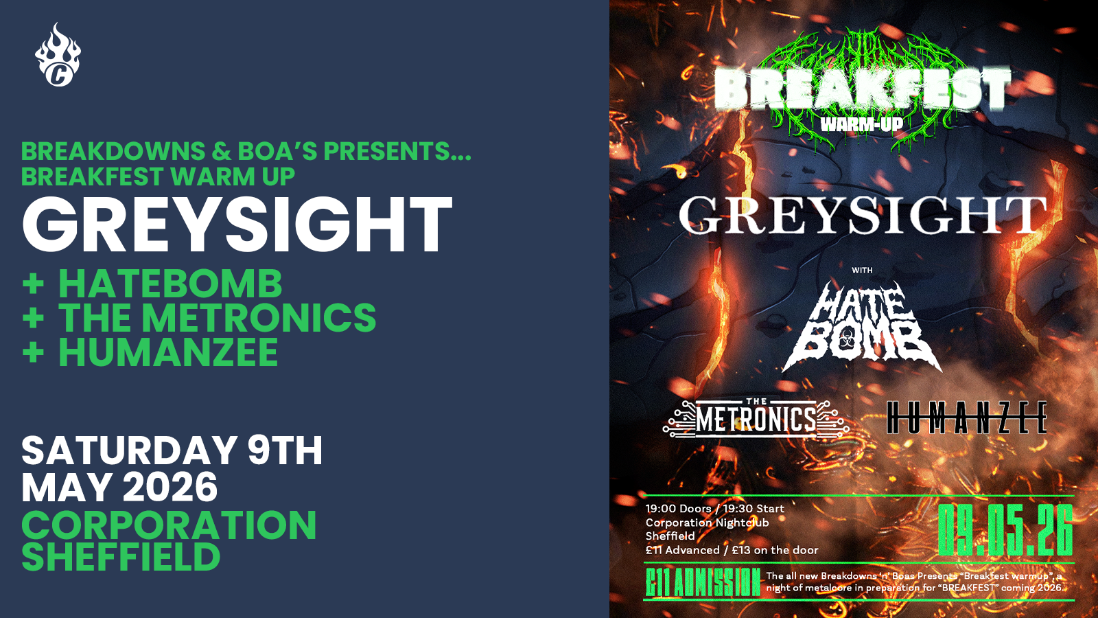 Headlining the night are Leeds based heavy hitters Greysight, whose sound blends metalcore and nu metal with dark, atmospheric intensity. Known for pairing crushing riffs with emotional depth, they stand out as one of the most exciting emerging names in the UK underground. Joining them are three accompanying bands, each adding their own edge to the lineup and building a dynamic, hard-hitting bill from start to finish. Break Fest Warm Up sets the tone for summer loud, immersive, and unmissable.