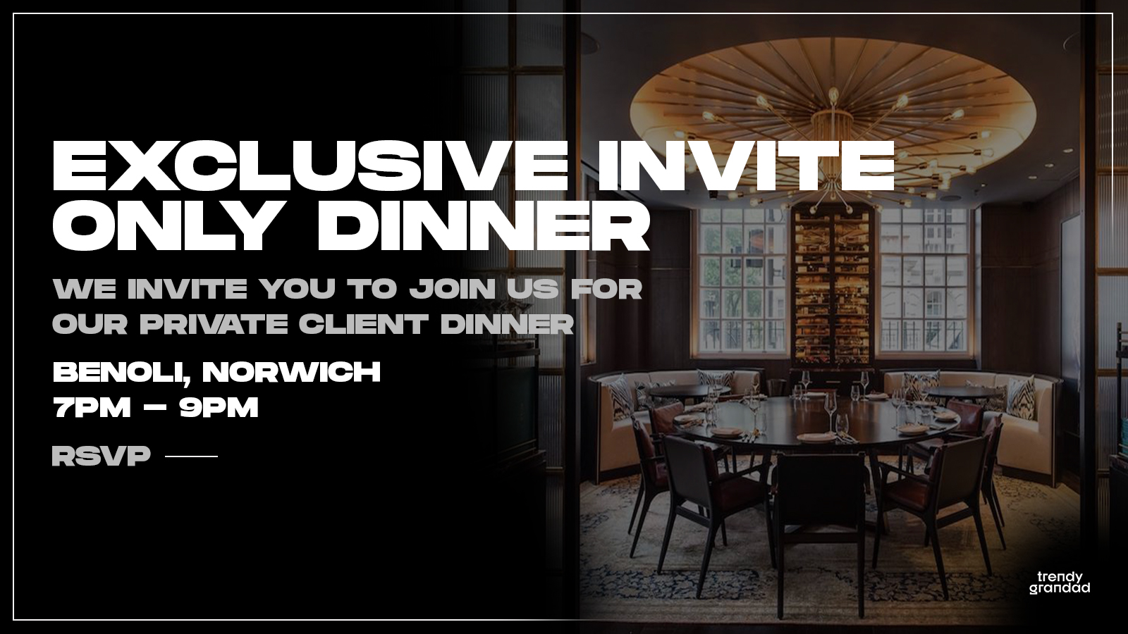 We invite you to an exclusive client dinner hosted by Trendy Grandad at Benoli's private dining room.