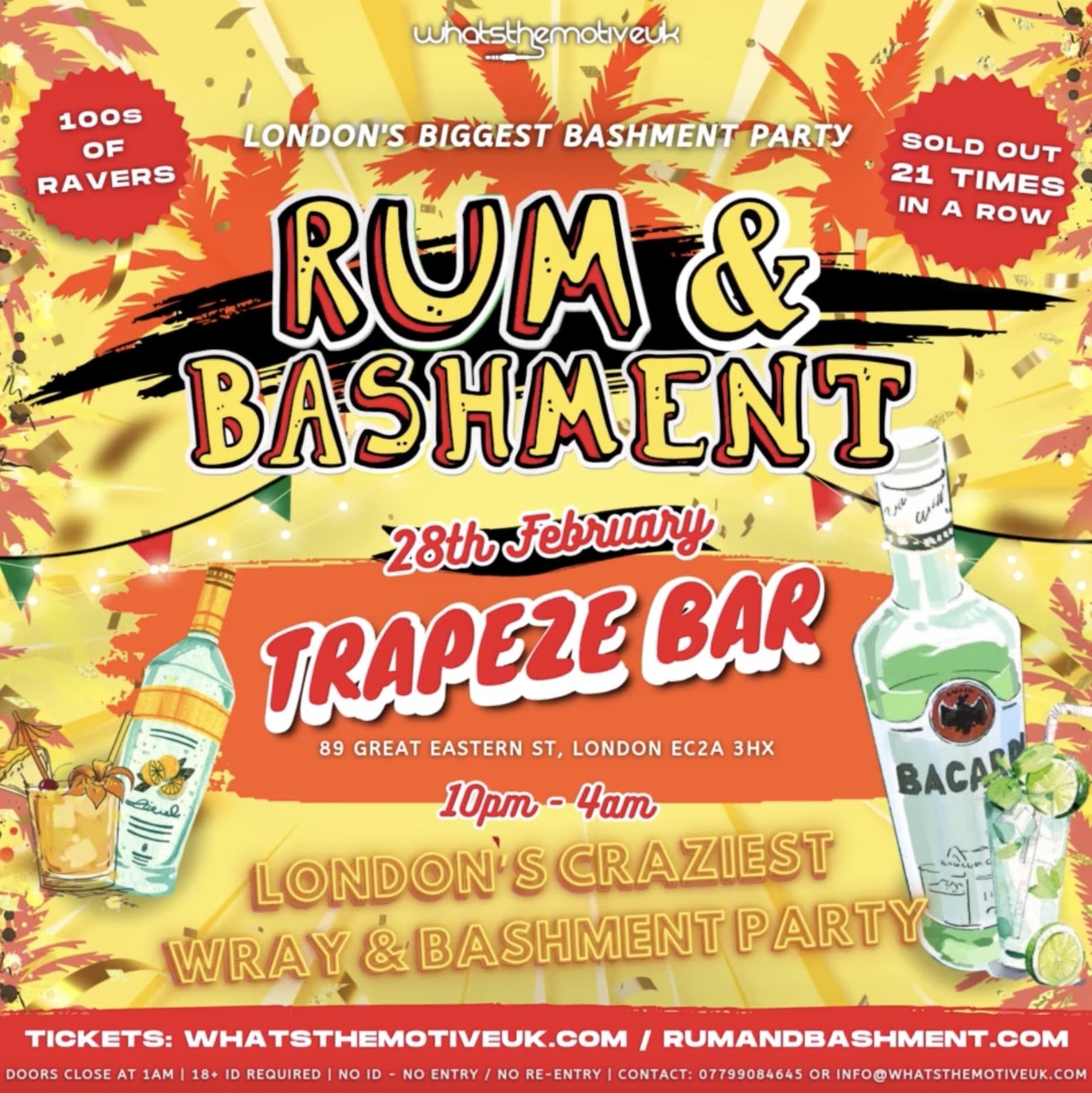 Get ready and join 100s of people for RUM & BASHMENT, the CRAZIEST Rave of 2024 with all your favourite DJs playing the best in Reggae, Bashment, Soca & Afrobeats all This will be a SOLD out experience like none-other as we prepare the WILDEST Club Night in the heart of Shoreditch