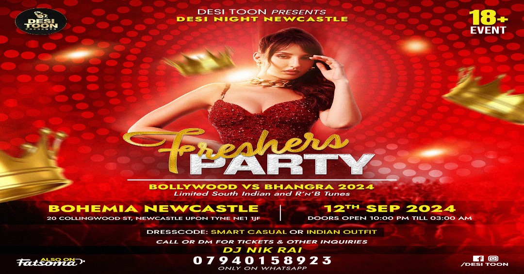 LETS PARTY DESI STYLE FOR FRESHERS & DESI VIBE IN NEWCASTLE TOP VENUE BOHEMIA, WE ARE HAVING YET ANOTHER SUMMER BOLLYWOOD VS BHANGRA N SOUTH INDIAN ICON SONGS PARTY ON THRUSDAY 12th SEPTEMBER 2024 AT 10.00pm at BOHEMIA NEWCASTLE, COLLINGWOOD STREET, NEWCASTLE UPON TYNE, UK.