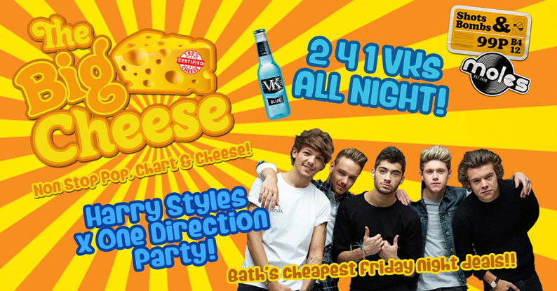 Bath's BEST night of Non Stop Cheesy Pop drops it's legendary party's of Chart, Pop & Cheese bangers EVERY FRIDAY at Moles with Bath's CHEAPEST Friday night drinks deals & entry!