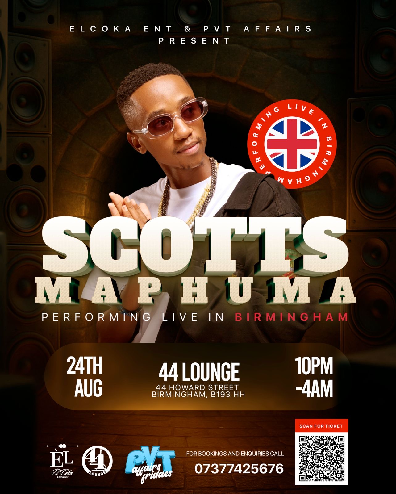 Presented by ElCoka Ent, this electrifying night will feature Scotts Maphuma performing live at the stylish 44 Lounge, located at 44 Howard Street, Birmingham, B19 3HH.