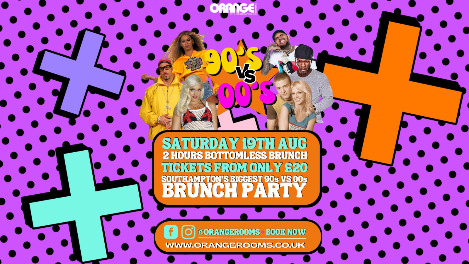 Southampton's Best Brunch Partys brings you 90s v 00s all the best music over the 2 decades🔥! All tickets include FREE entry to Orange Rooms after the event to carry on the party until 3am!
