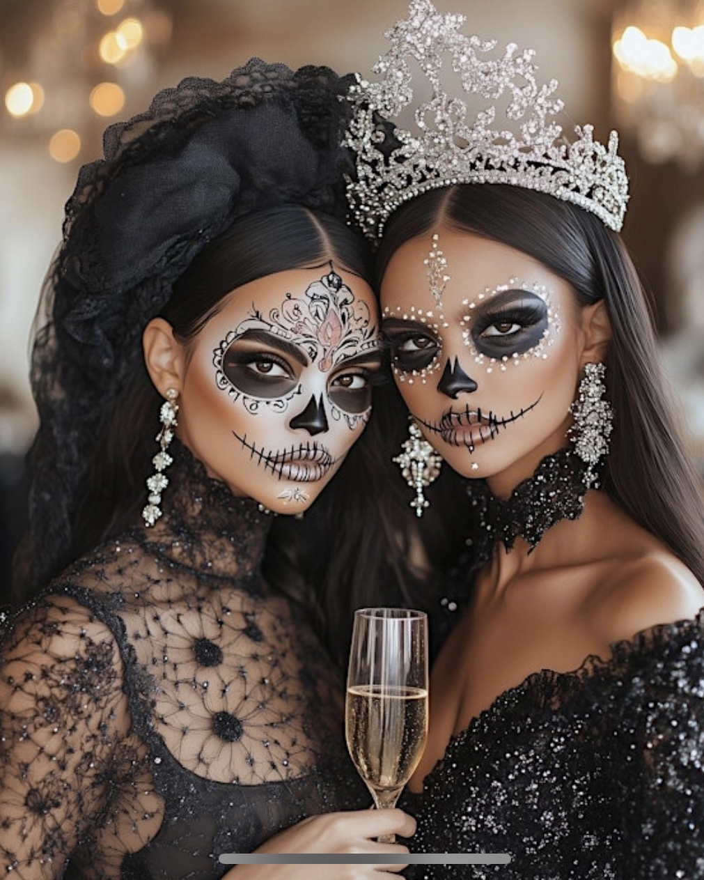 Accents: Sugar-skull glamour 💀 | Intricate masks 🎭 | Dramatic florals 🌹 | Flower crowns for a touch of Día de los Muertos authenticity