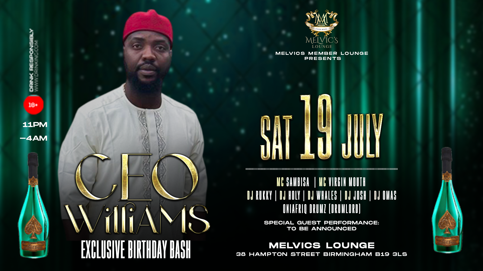 The BIGGEST night of the summer lands at Melvic’s Lounge as we celebrate the one and only CEO WILLIAMS in true VIP style! 🎉🍾