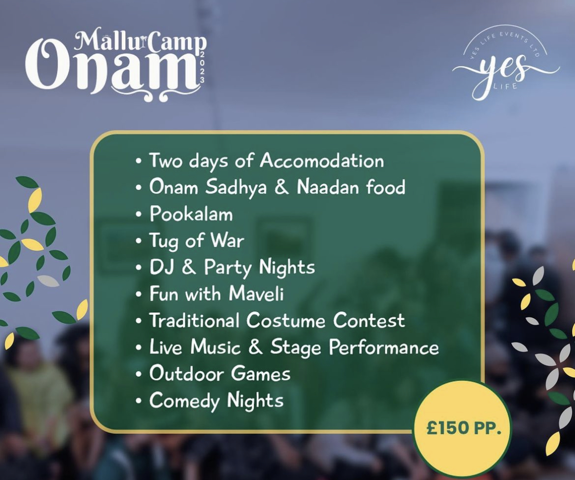 Celebrate Onam with us, the ultimate gathering exclusively for Mallus in the UK! Join us for a two-day extravaganza filled with traditional naadan food, unlimited fun, exciting games, captivating live music, and a DJ night that will make you dance to your heart's content. Get ready to immerse yourself in the vibrant spirit of Onam and create unforgettable memories with fellow Malayalis.