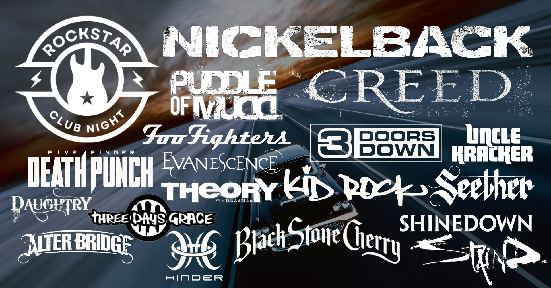 Nickelback/ Creed/ 3 Doors Down/ Foo Fighters/ Shinedown/ Seether/ Puddle Of Mudd/ Alter Bridge/ Black Stone Cherry/ Uncle Kracker/ Papa Roach/ Three Days Grace/ Breaking Benjamin/ Staind/ Hoobastank/ Incubus/ Black Stone Cherry/ Kid Rock/Five Finger Death Punch/ Evanescence and many more!