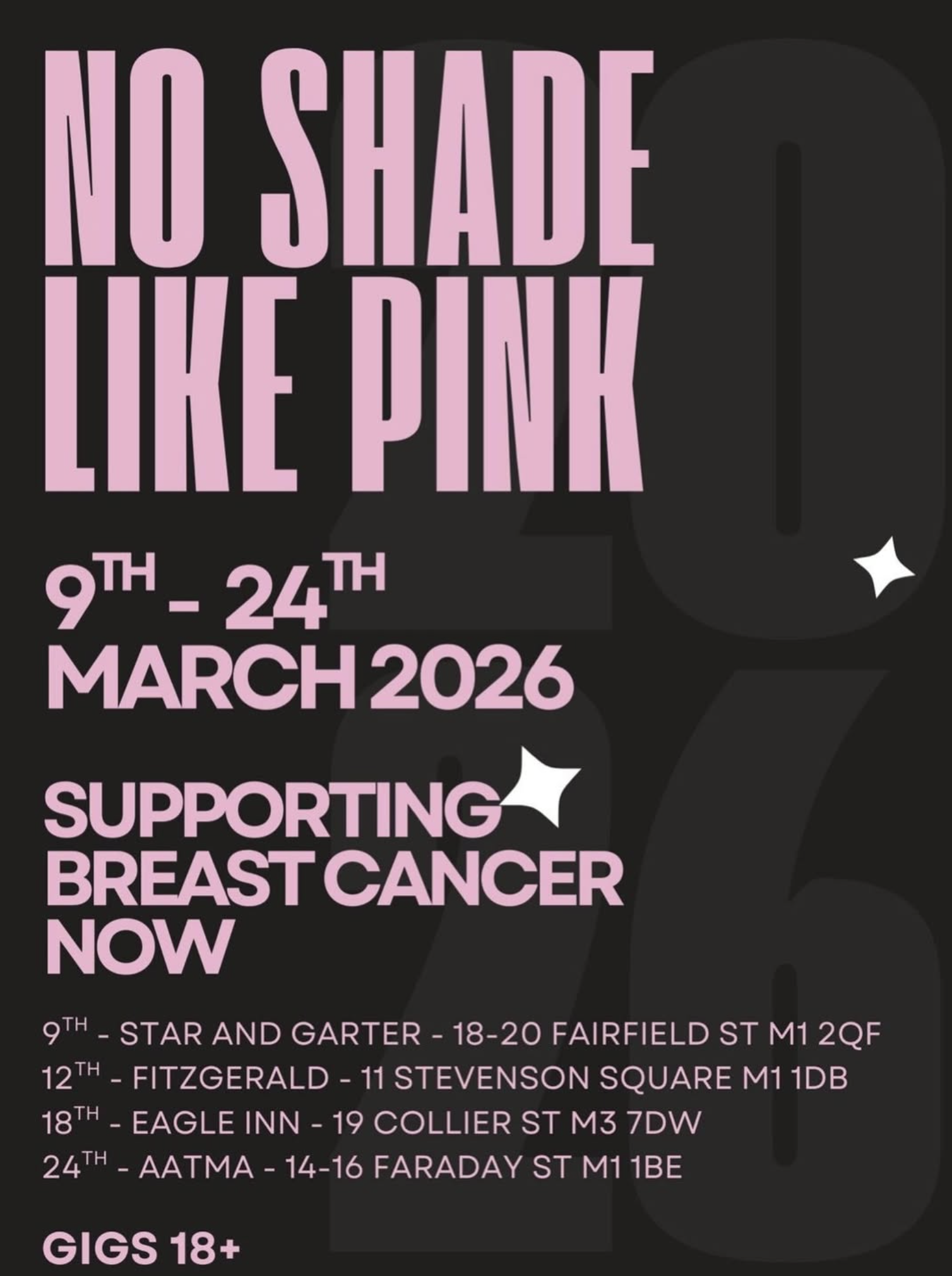 Join No Shadow Like Shade at The Fitzgerald for a night of rock and heavy metal music, raising money for Breast Cancer Now! With Soulist, Bleach, Cataclyt and Bleachwear.