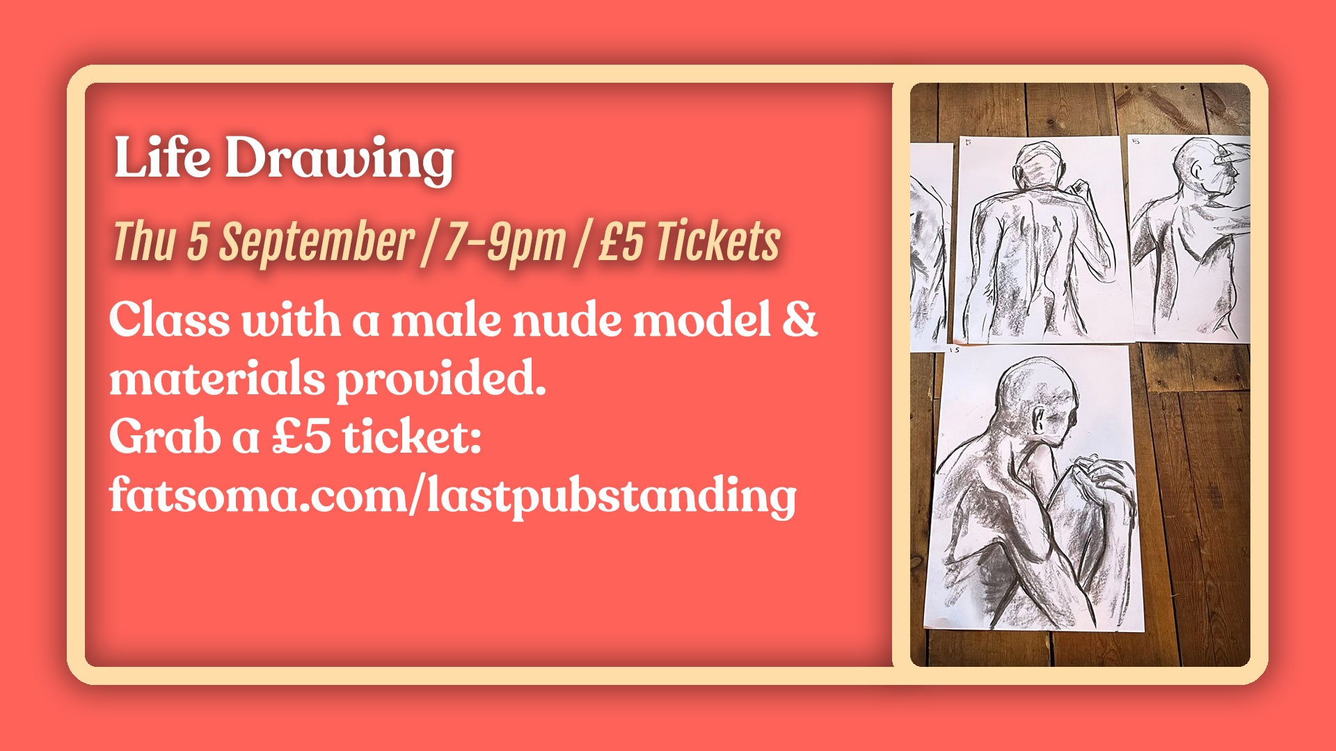 This will be in our lovely upstairs bar. Materials are provided as well as a nude male model. This event is 18+.