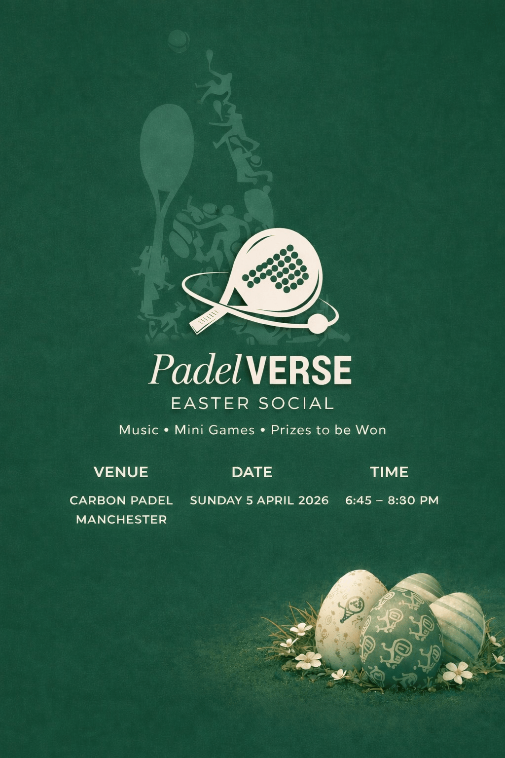 Join us for a special PadelVerse Easter Social — an evening of padel, music, and great energy. Whether you're coming to compete, connect, or just enjoy the vibe, expect a well-curated session with a mix of mini games and social play.