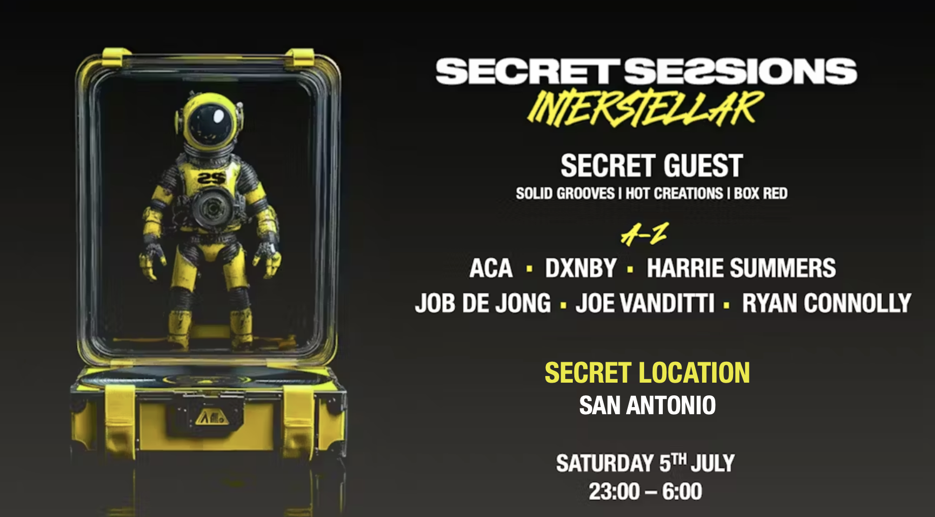 Expect secret surprises and the biggest-ever SECRET GUESTS making unexpected appearances. And, of course, the Secret Sessions family of DJs, dancers, and entertainers—ready to take you on an unforgettable journey.
