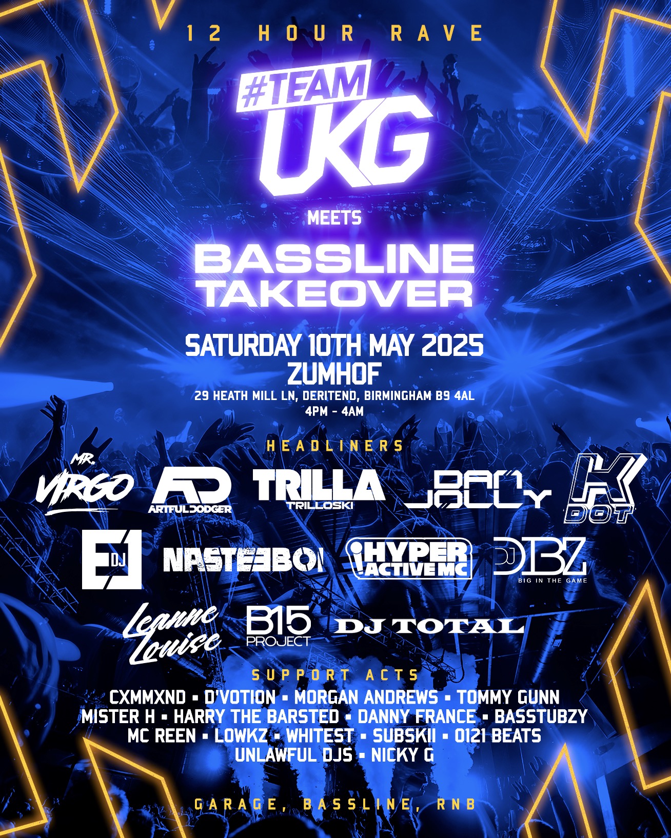 Team UKG & Bassline Takeover are coming to Birmingham FINALLY!!!!! We have secured the amazing Zumhof for a 12 HOUR RAVE!!!! Come party with us on Saturday 10th May 2025. This will be the Biggest party in Birmingham.
