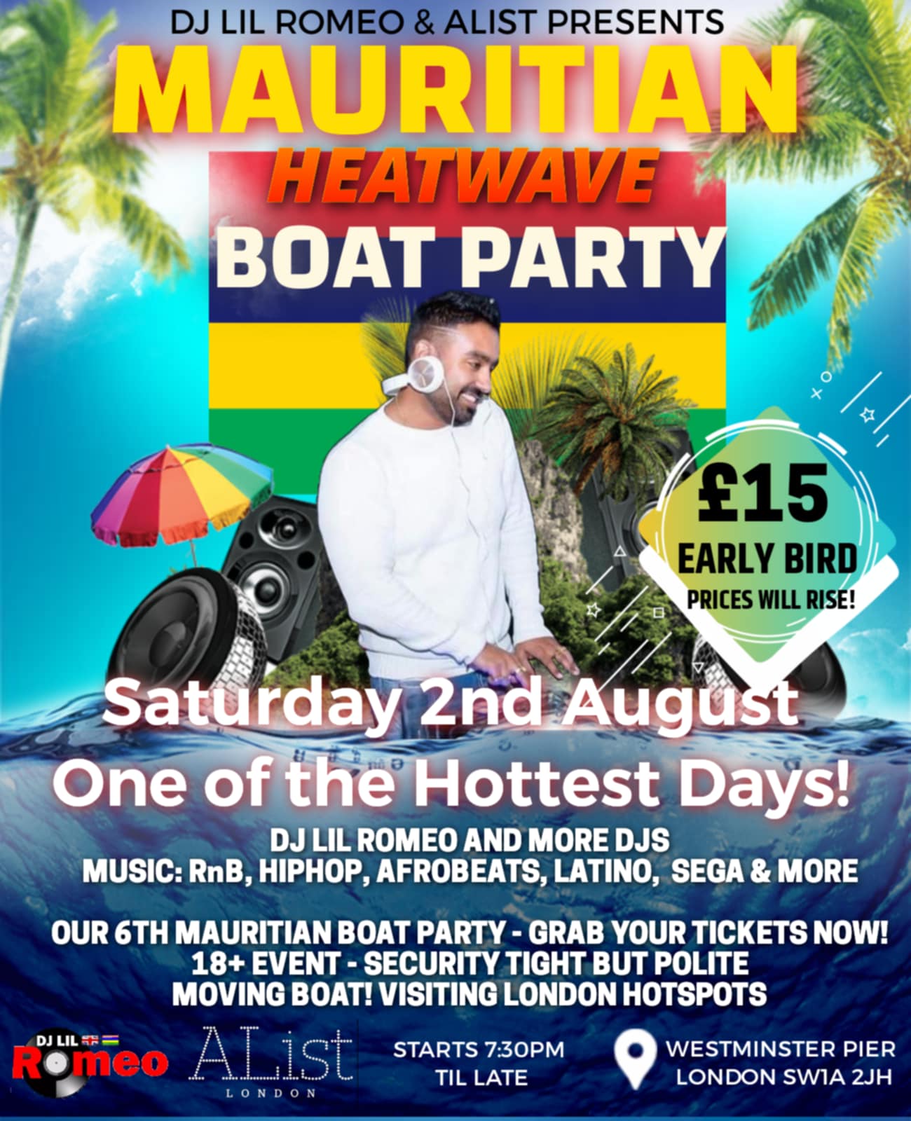 Enjoy the London Views by night on one of the hottest months in London on Saturday 2nd August. The boat will cruise up and down the Thames River with Mauritian Party vibes! The boat departs 8 pm sharp, so please be at Westminster Pier on time (ideally 7:30 pm).