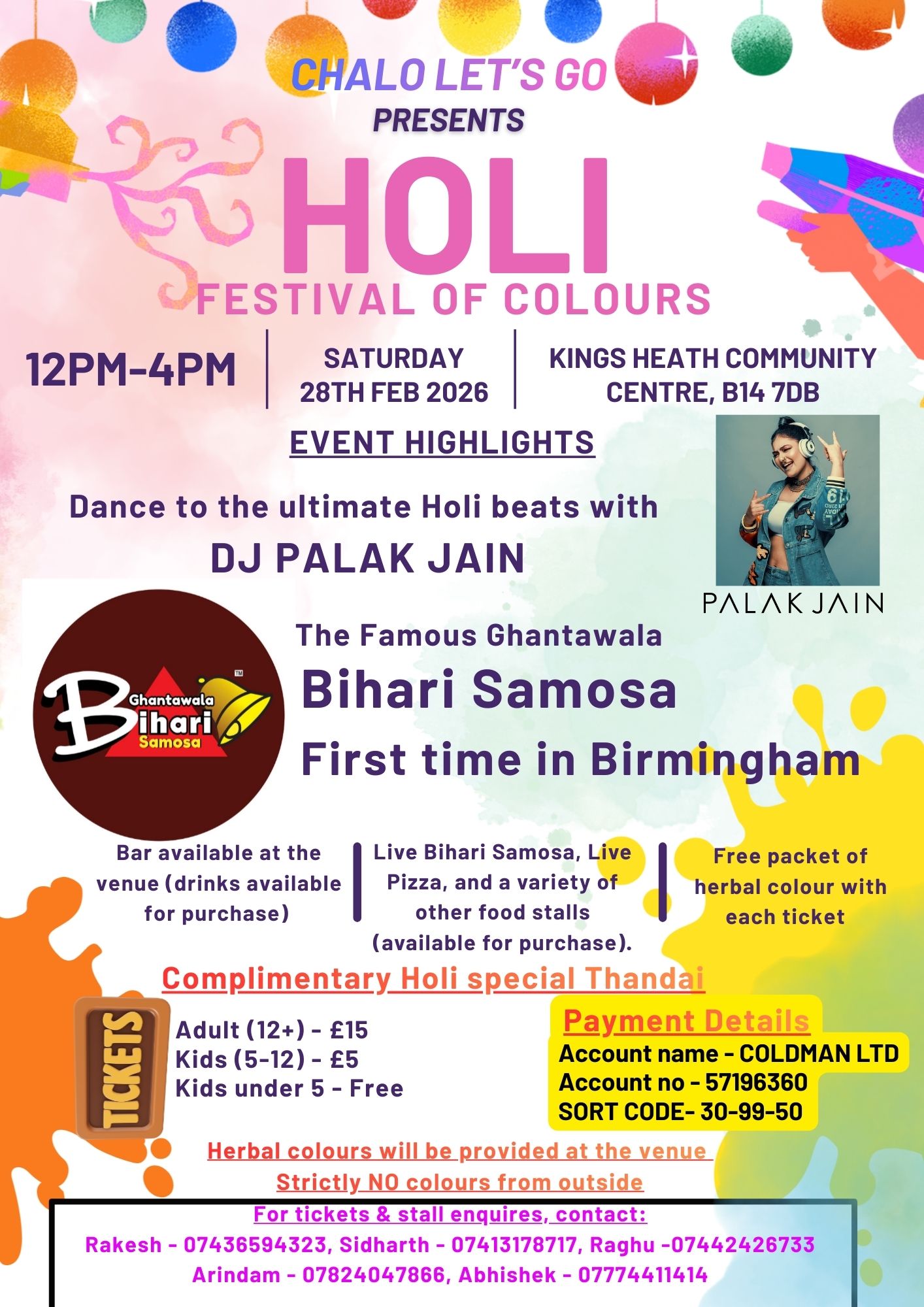 Get ready for an explosion of colour, music, and the UK’s most talked-about street food! Chalo Let’s Go presents a high-energy, family-friendly Holi celebration like no other.