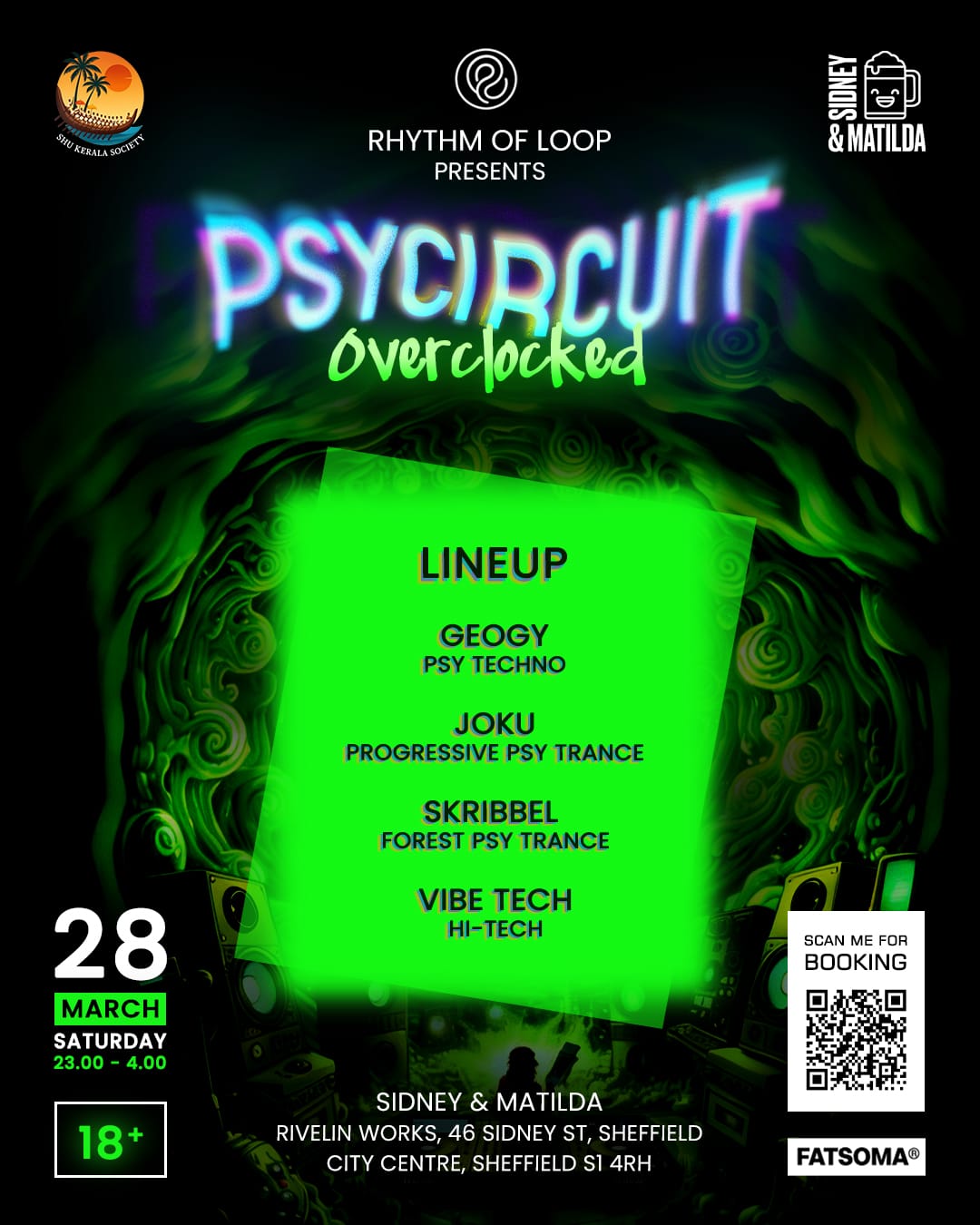 On March 28th, the RHYTHM OF LOOP, SHEFFIELD bringing back Psycircuit experience, but this time it’s Overclocked! We’re cranking up the energy and pushing the limits of sound with an epic fusion of Psy Techno, Progressive Psy, Forest Psy, and Hi-Tech — all delivered in the underground rave atmosphere you know and love. Prepare for a mind-bending night as we take you on a sonic journey through high-energy beats, futuristic visuals, and next-level production.