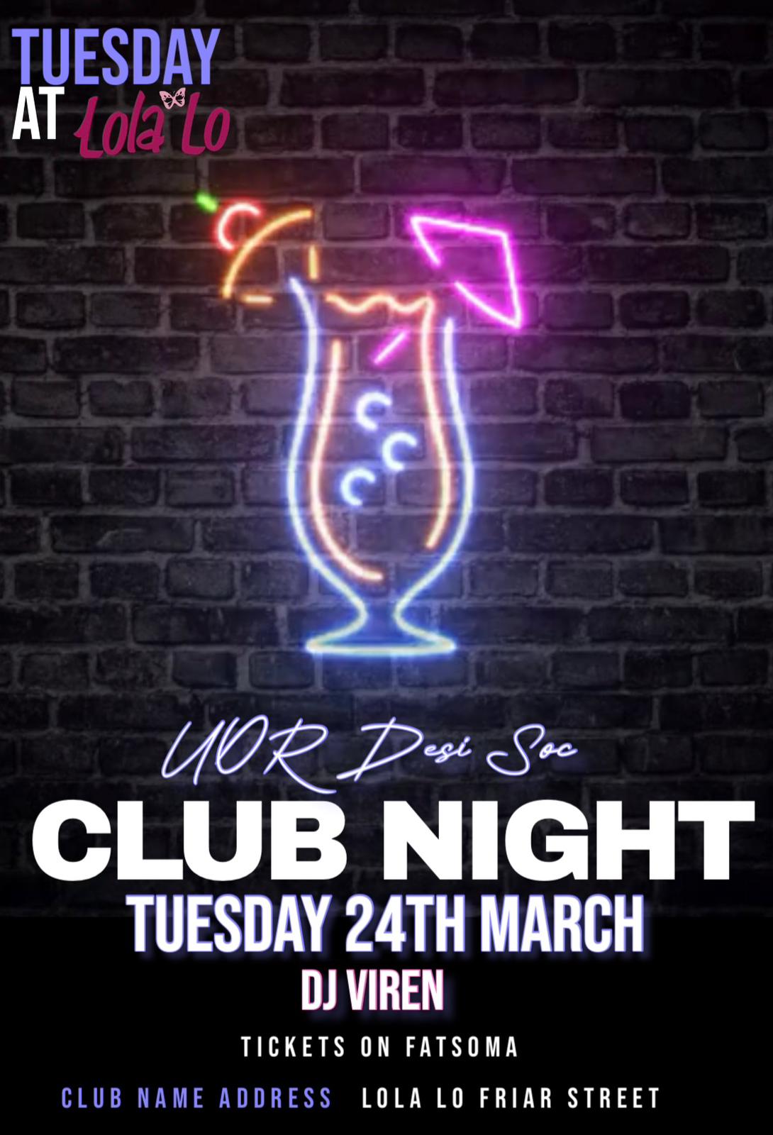 Get ready for one of the biggest Desi nights of the term as we take over Lola Lo for an unforgettable club night featuring DJ Viren bringing the best Bollywood, Bhangra, Punjabi, and R&B beats all night long 🎶